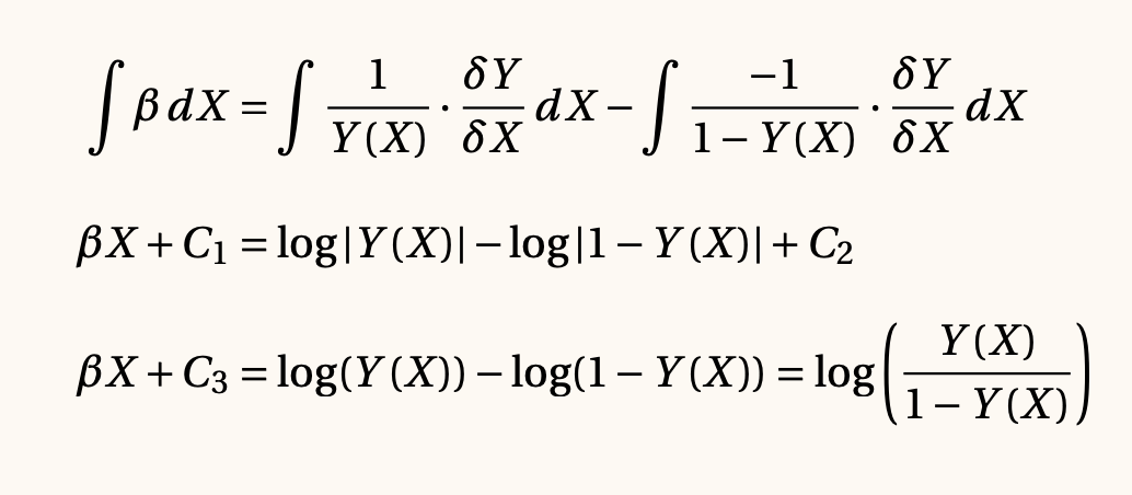 Estamos listos para integrar beta con respecto a X. Dado que Y(X) está entre 0 y 1, podemos omitir los valores absolutos y unificar las constantes de integración en una sola, a la que llamamos C₃. Aplicamos además una propiedad del logaritmo que permite convertir la resta de logaritmos en el logaritmo del cociente: